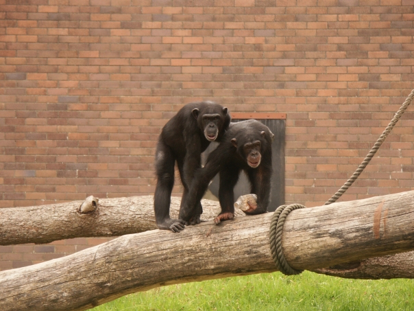Chimpanzees are very sociable primates and will assist each other in the gathering of useful or curious items such as the case of these two adult chimps.
