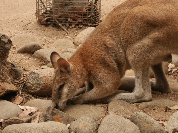 Medium-sized brown kangaroo scavenging between rocks with steel-mesh enclosed object in the background.