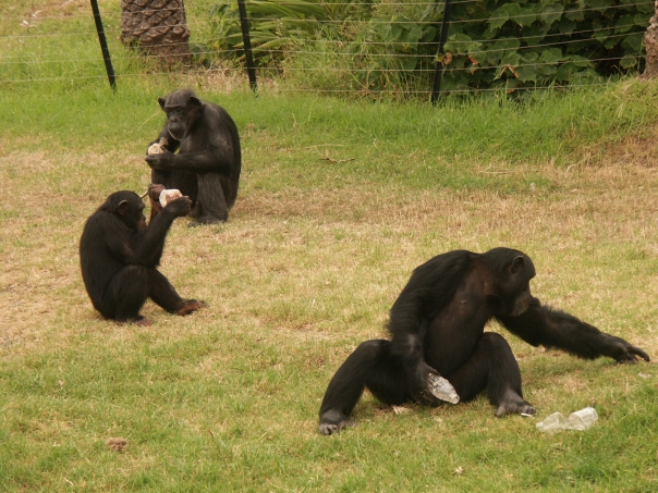 Three apes sitting on grass one of them playing with water bottles.