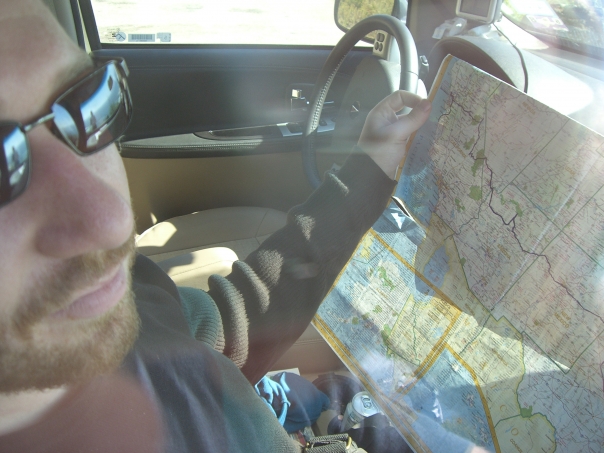 Man with sunglasses is reading a map while driving in a car.