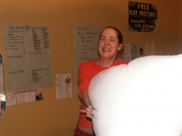 A beautiful orange dressed girl is playing with white pillow in her room.
