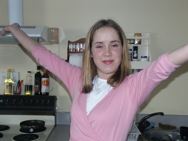 A girl in a pink sweater looks pleased with herself as she stretches out her arms for a picture inside her kitchen.