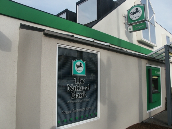 A sign advertising the National Bank on a wall. The logo of a prancing horse represents the bank.