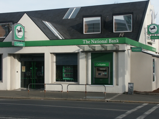 photo of green & whie bank buildingtaken from across the street