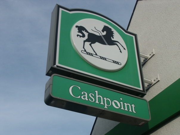 close up photo of a green and black sign with a bucking horse outside a Cashpoint location
