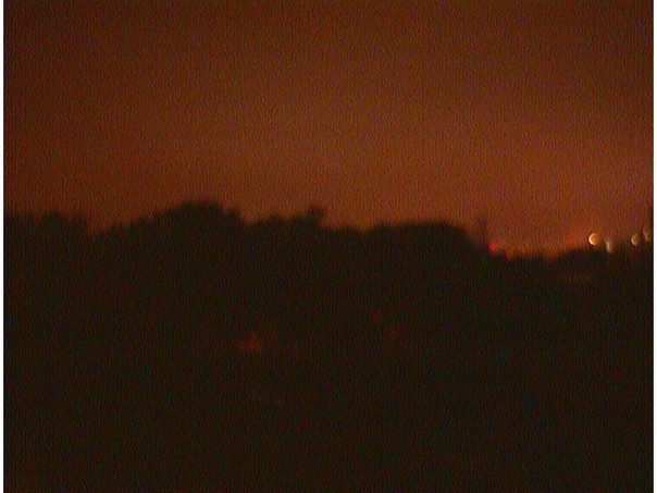 In the bleak darkness of night, a few blurry, distant lights flickered in the background. |