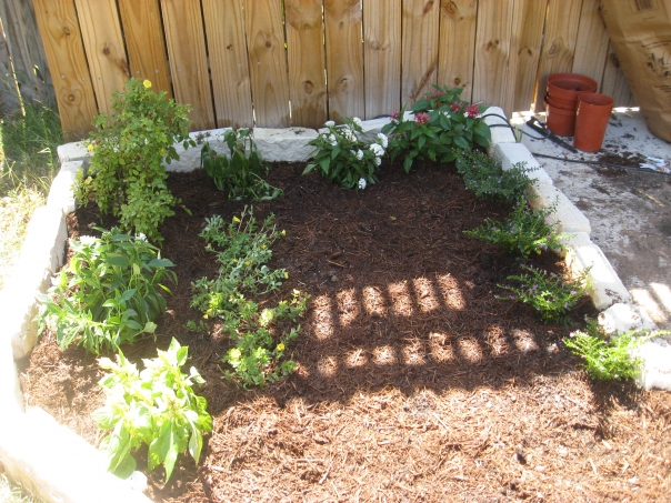 She managed to weed the entire area, purchase all of the dirt, mulch, and flowers, and plant all of the new flowers too.