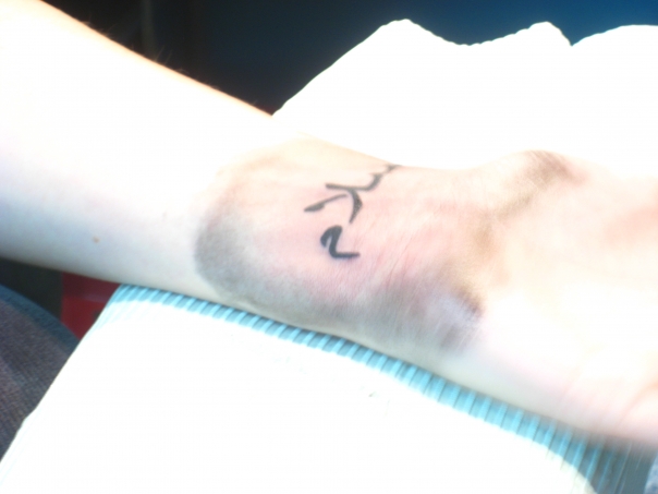 This is a small foreign tattoo located on inside forearm of a human being.