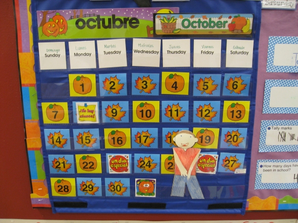 This is a classroom calendar showing the month of October. The calendar uses both English and Spanish labels for days and the month. |