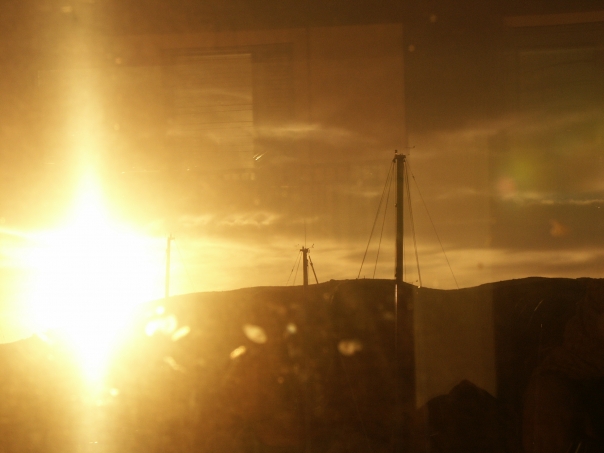 Sunrise over the mountains. It is hard to tell if there are electric lines or silos in the picture. The sun is to bright.