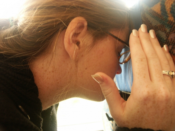 A young woman praying, her head resting against the back of the airline seat in front of her.