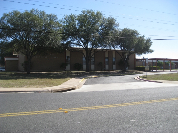 There is a picture of an elementary school on a sunny day.