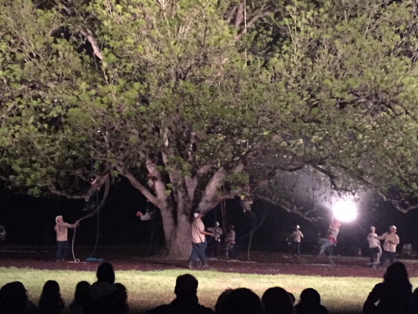 Several men hoist themselves up, climbing ropes hanging from a large tree.
