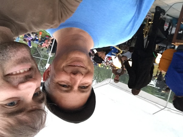 The picture shows two men aware that they are having their photo taken, but it is upside down.
