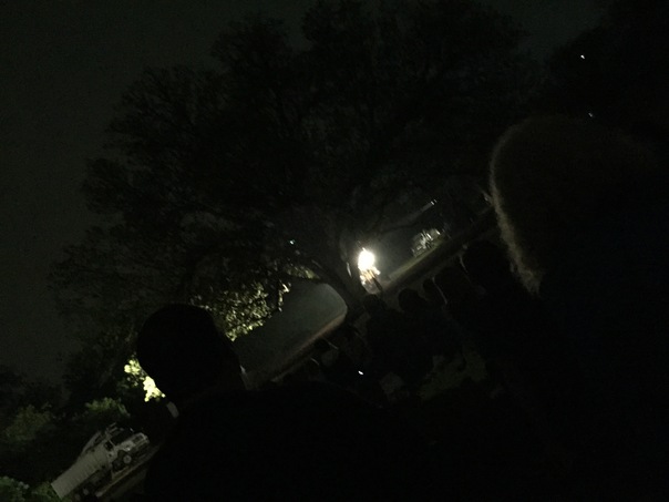 dark photo at a weird angel of some trees in a grove with lights in the background.