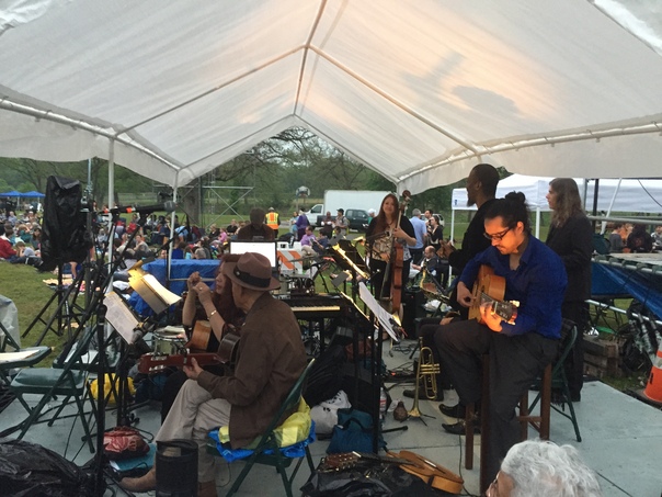 A group of musicians under a tend standing next to each other.