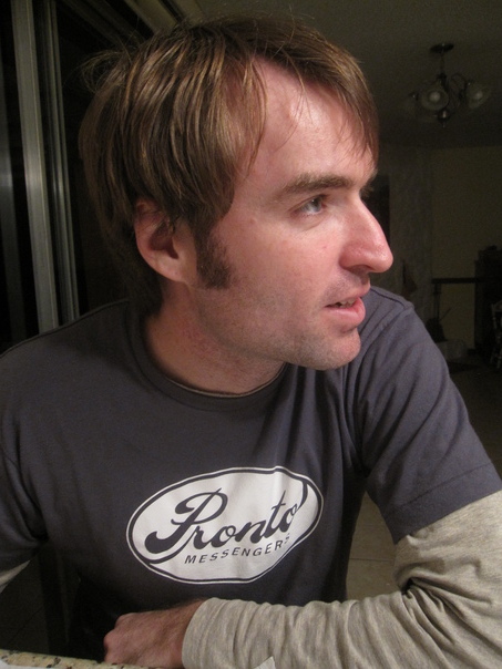 Closeup profile view of white male 20-30 years of age, with longish light brown hair and sideburn wearing a dark gray or black tee shirt with a white oval with the word Pronto in script and the word messenger in smaller all-caps letters, and the shirt is covering a long-sleeved light gray shirt.