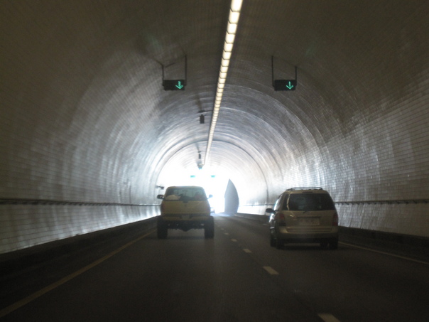 The two cars travel through the dark tunnel toward the light that is at the end.