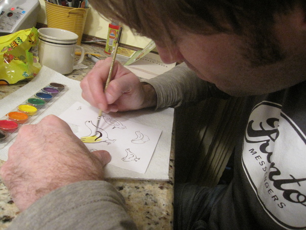 A man is using watercolors to paint a chicken yellow.