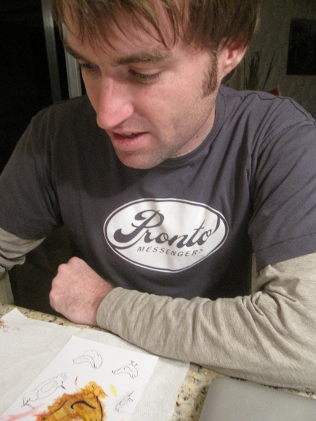 man, brown, hair, drawing, table, side burns, nose, hands, shirt, long sleeves,