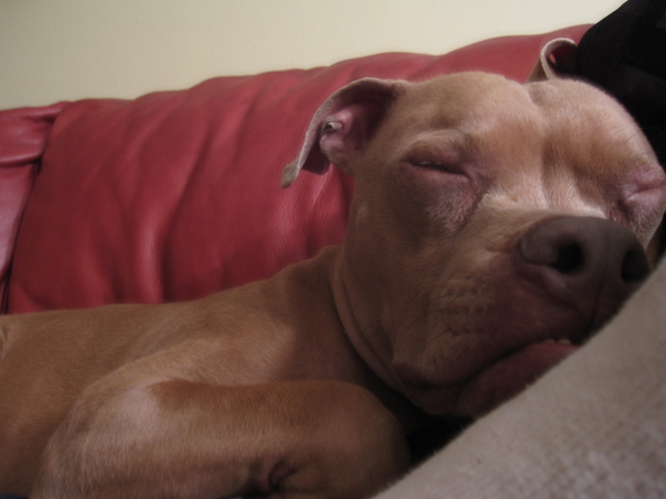 A brown pitbull sleeps on a white pillow on a red leather couch.
