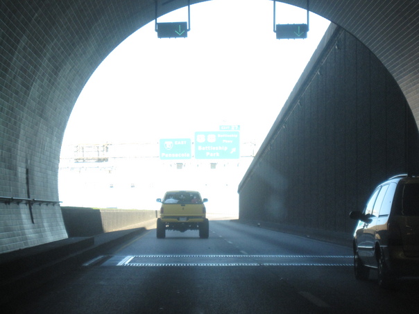 A yellow color car is going out from the cave to the higghways.