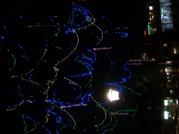 multi-colored lights in tree in town square