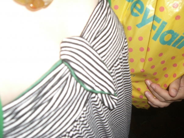 It is a picture taken from an angle over a lady's chest and wearing a dress which is tied in the front and she's carrying a yellow shopping bag.