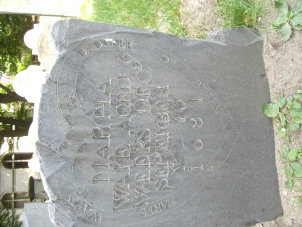 A very old tomb that reads "MARTHA WATE AGED 6 WEEKS DECD SEPTEMBER 16 1681"