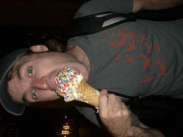 Backpack totting traveller wolfs down icecream cone for night-life photo.
