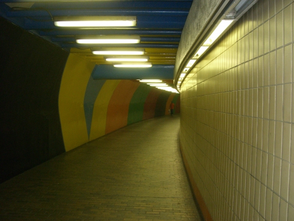 A gently curving subway with coloured vertical stripes on the wall and ceiling.