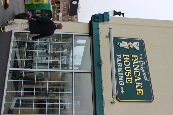 A man in a black shirt and khaki pants walks toward a light-brown restaurant building which has a green sign with gold and white lettering.