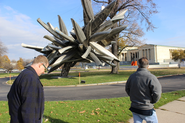 Two men walk past an abstract metal sculpture reminiscent of a Windows 98 screensaver.