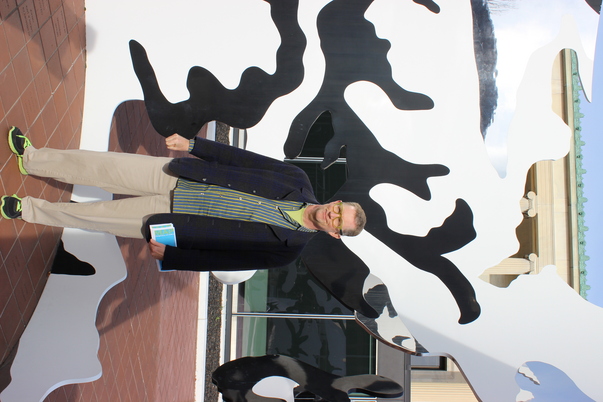 A man wearing a jacket and tan slacks stand in front of a black and white public art installation.