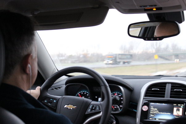 A MAN DRIVE A CHEVROLET CAR IN HIGHWAY WITH HEARING SOME THING