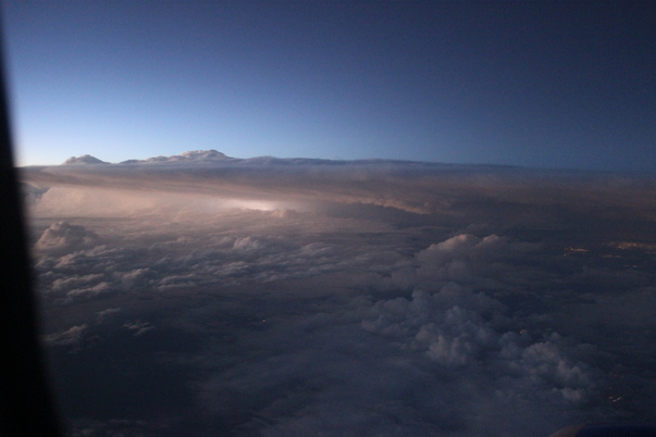 Aerial photo shows above the fluffy clouds shot with mountains against dull blue skies in the distance.