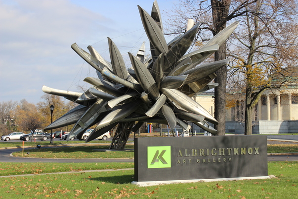 In this image, a metal, spiky sculpture sits on the green grass behind a grey and green sign for the Albright Knox Art Gallery.