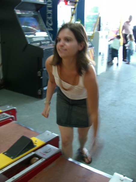 A lady playing skeet ball inside an arcade.