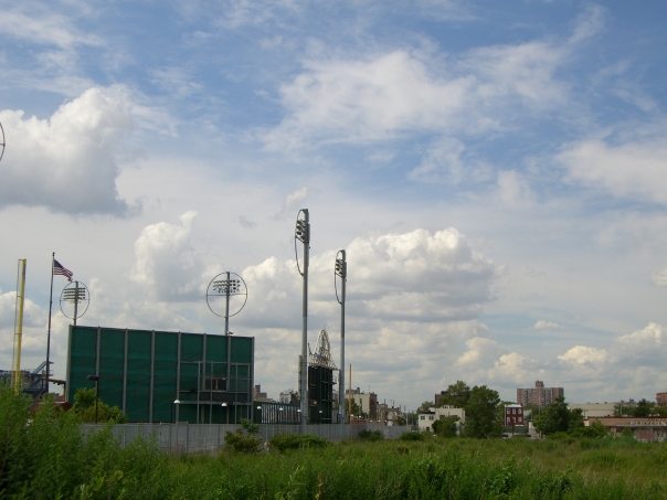 The back of a baseball field is in the distance, next to tall buildings and a field of tall grasses and weeds.