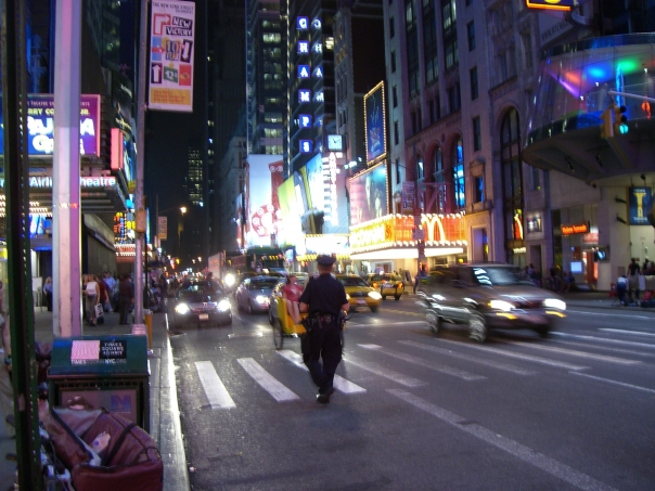 Photo of Times Square, NYC, area, with policeman walking in street against (blurred) traffic. Theater on left is presenting "The Pajama Game." Other details include a brightly lit McDonald's marquee.
