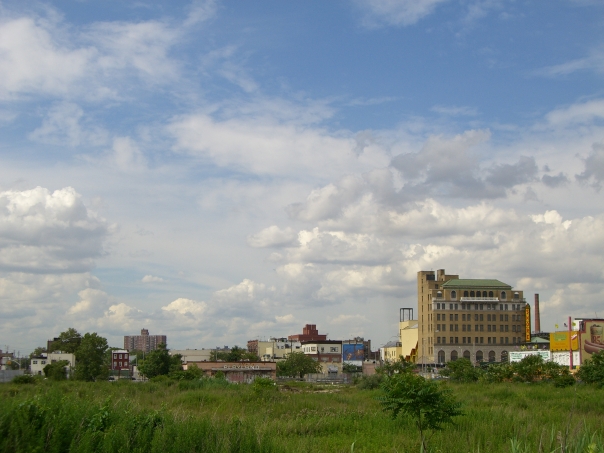 Photo taken from a spacious open field with a fews bits of shubbery.Factory on right in background.Some residential buildings on left.