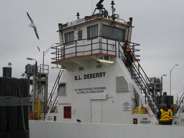 Docked ship, the B.L. Deberry. White ship with three men present with life jackets on.