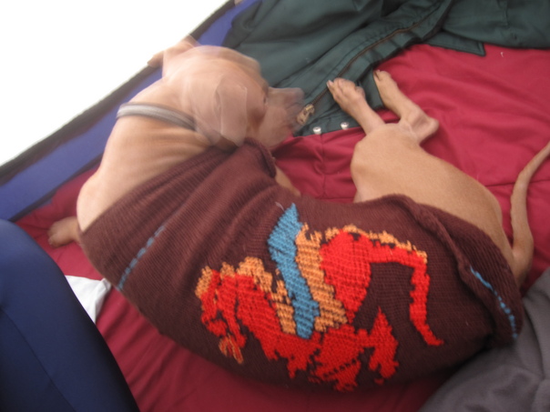 A brown dog lays covered by a maroon blanket that features a red knit design.