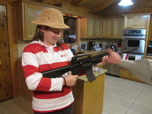 A woman in a red striped jersey and tan cap holds an assault weapon as she stands in a large kitchen.