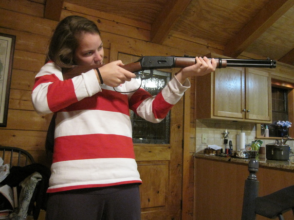 In a rustic room, a young woman practices aiming a rifle.