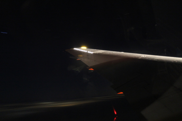 A view of a airplane window looking out over the airplaine wing at night.