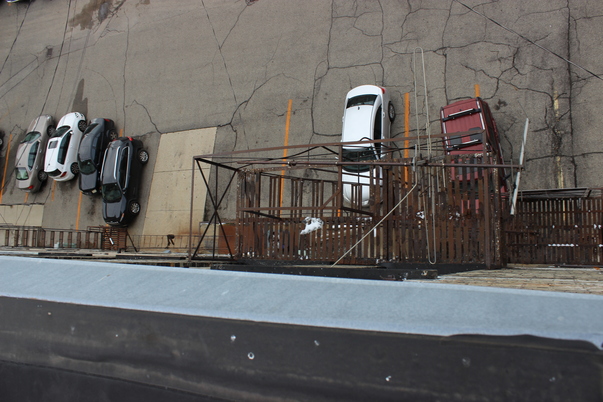 The somewhat empty parking lot has a lot of cracks in the cement.