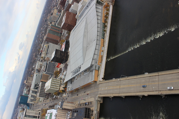 Aerial view of an arena next to the water and a four lane highway.