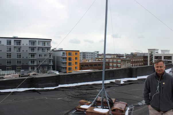 Guy standing on top of a building with hands in side the pockets.