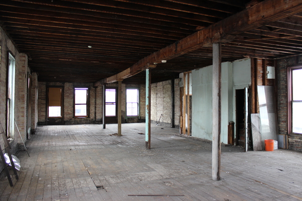 An abandoned warehouse shows many wooden beams and floor boards that will recycled into other usable items.
